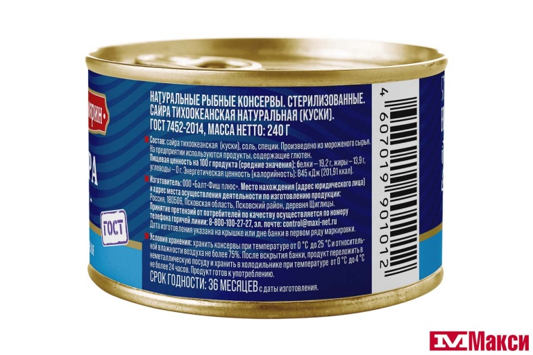 САЙРА ТИХООКЕАНСКАЯ НАТУРАЛЬНАЯ "СЫТЫЙ БОЯРИН" 240Г Ж/Б