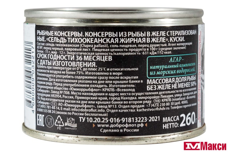 СЕЛЬДЬ ТИХООКЕАНСКАЯ В ЖЕЛЕ 260Г Ж/Б (ДОБРОФЛОТ)