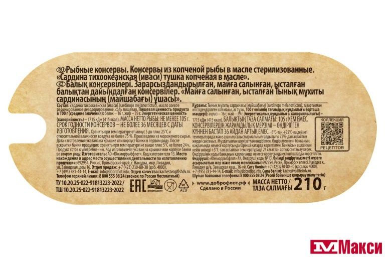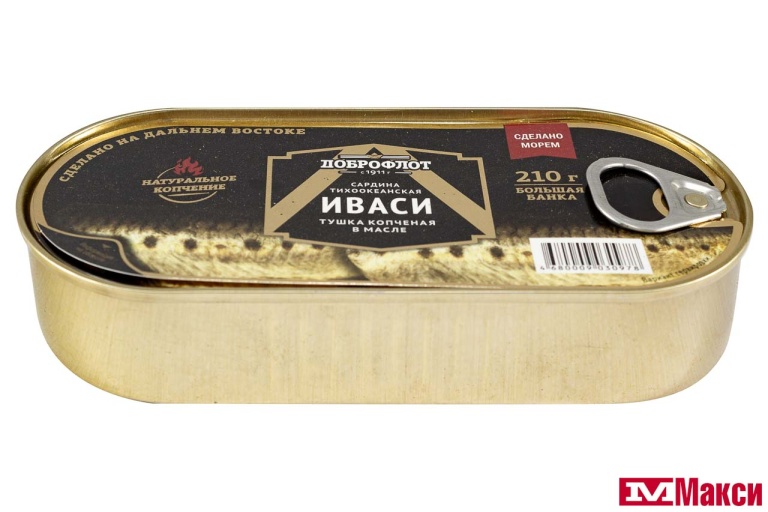 САРДИНА (ДОБРОФЛОТ) ТИХООКЕАНСКАЯ ИВАСИ ТУШКА КОПЧЕНАЯ В МАСЛЕ 210Г Ж/Б