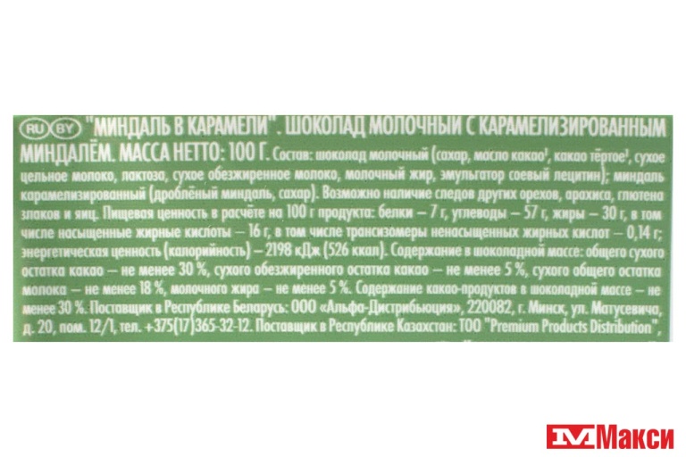шоколад молочный (сахар, масло какао1, какао тёртое1, сухое цельное молоко, лактоза, сухое обезжиренное молоко, молочный жир, эмульгатор соевый лецитин); миндаль карамелизированный (дроблёный миндаль, сахар)