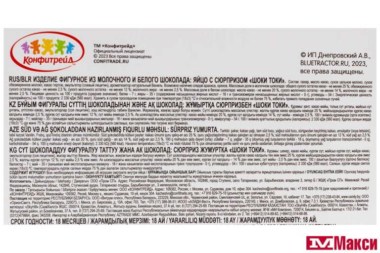ЯЙЦО ШОКОЛАДНОЕ "ШОКИ-ТОКИ" СИНИЙ ТРАКТОР/ЧЕБУРАШКА С СЮРПРИЗОМ 20Г (КОНФИТРЕЙД)