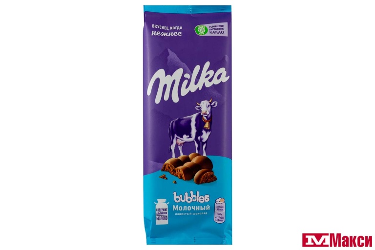 Шоколад молочный пористый "Milka Bubbles", 80 г. Воздушные пузырьки пористого молочного шоколада мгновенно тают во рту, оставляя нежное послевкусие и волшебное настроение. Milka – нежность внутри!