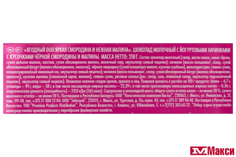 шоколад молочный (сахар, масло какао, какао тёртое, сухое цельное молоко, лактоза, сухое обезжиренное молоко, молочный жир, эмульгатор соевый лецитин); начинка (масло пальмовое, сахар, сухой обезжиренный йогурт (молоко обезжиренное, закваска), чёрная смородина (сухой концентрат мякоти, кусочки сушёные), мальтодекстрин, сливки сухие, концентрированный лимонный сок, эмульгатор соевый лецитин); начинка (масло пальмовое2, сахар, сухой обезжиренный йогурт (молоко обезжиренное, закваска), кусочки малины (глюкозный сироп, малина), сливки сухие, рисовые хлопья (рис, сахар, соль, ячменный солод, эмульгатор подсолнечный лецитин), эмульгатор соевый лецитин).
