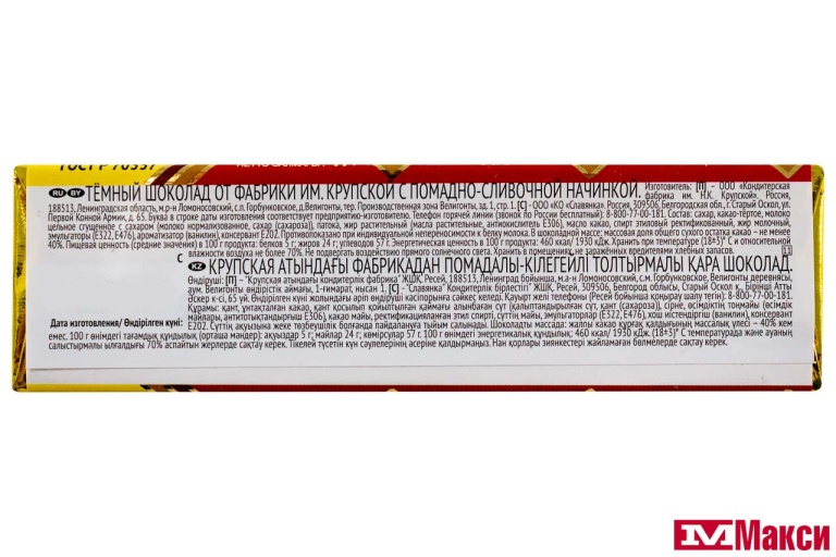 ШОКОЛАДНЫЙ БАТОНЧИК ТЕМНЫЙ С ПОМАДНО-СЛИВОЧНОЙ НАЧИНКОЙ 47Г (КРУПСКАЯ)