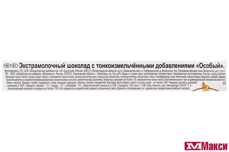 ШОКОЛАД "ОСОБЫЙ" ЭКСТРАМОЛОЧНЫЙ С ТОНКОИЗМЕЛЬЧЕННЫМИ ДОБАВЛЕНИЯМИ 85Г (КРУПСКАЯ)