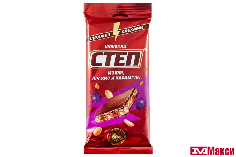 Шоколад Степ молочный с изюмом арахисом и карамелью.