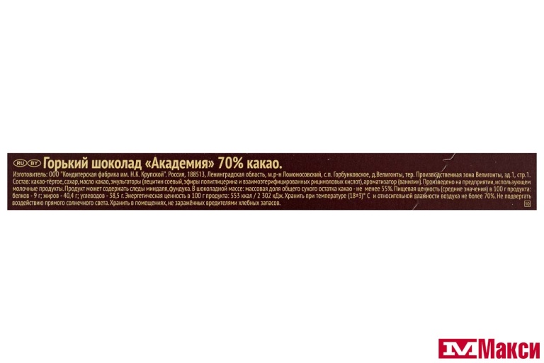 ШОКОЛАД "АКАДЕМИЯ" ГОРЬКИЙ ПОРЦИОННЫЙ 70% КАКАО 88Г (КРУПСКАЯ)