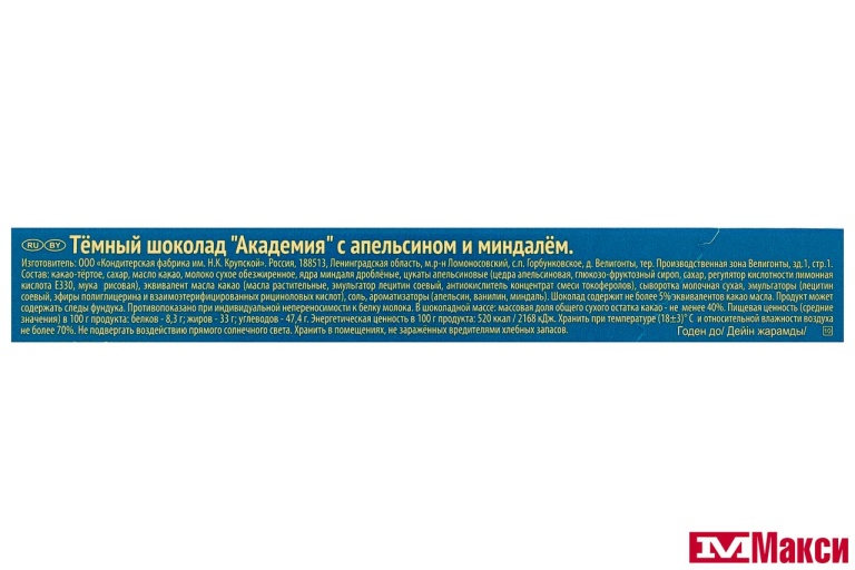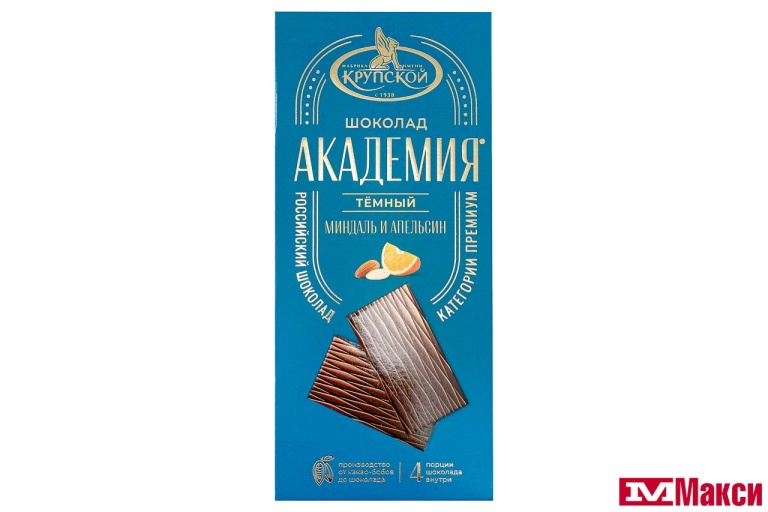 ШОКОЛАД "АКАДЕМИЯ" ТЕМНЫЙ ПОРЦИОННЫЙ С АПЕЛЬСИНОМ И МИНДАЛЕМ 88Г (КРУПСКАЯ)