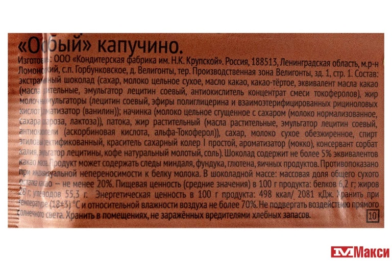 экстрамолочный шоколад (сахар, молоко цельное сухое, масло какао, какао-тёртое, эквивалент масла какао (масла растительные, эмульгатор лецитин соевый, антиокислитель концентрат смеси токоферолов), жир молочный, эмульгаторы (лецитин соевый, эфиры полиглицерина и взаимоэтерифицированных рициноловых кислот), ароматизатор (ванилин)); начинка (молоко цельное сгущенное с сахаром (молоко нормализованное, сахара (сахароза, лактоза)), патока, жир растительный (масла растительные, эмульгатор лецитин соевый, антиокислители (аскорбиновая кислота, альфа-Токоферол)), сахар, молоко сухое обезжиренное, спирт этиловый ректификованный, краситель сахарный колер I простой, ароматизатор "мокко", консервант сорбат калия, эмульгатор лецитины, кофе натуральный молотый, соль)