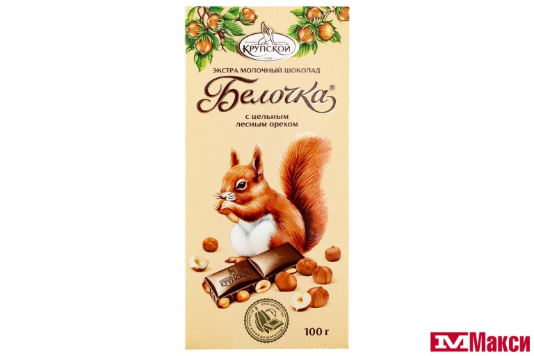 ШОКОЛАД "БЕЛОЧКА" ЭКСТРАМОЛОЧНЫЙ С ЦЕЛЬНЫМ ФУНДУКОМ 100Г (КРУПСКАЯ)
