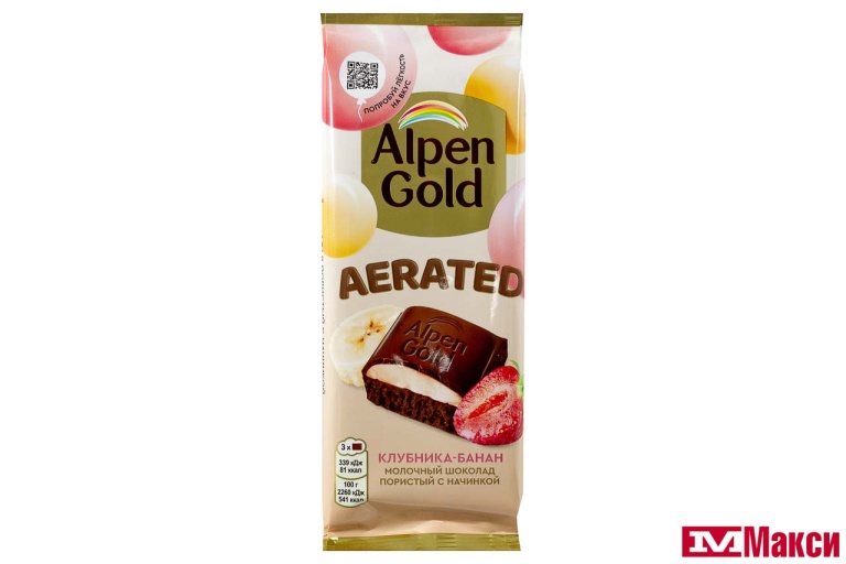 Шоколад молочный пористый "АЛЬПЕН ГОЛЬД" AERATED (пористый) с клубнично-банановой начинкой.