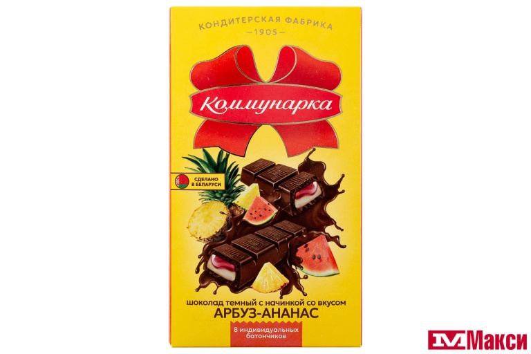 шоколад темный (сахар, какао тертое, масло какао, эмульгаторы (Е322, Е476), ароматизатор натуральный «Ваниль»), начинка двухслойная комбинированная – фруктовая (пюре яблочное (яблоки свежие), сахар, патока, жир кондитерский (рафинированные дезодорированные растительные масла в натуральном и модифицированном виде, антиокислители: аскорбиновая кислота, Е307), агент влагоудерживающий сорбитовый сироп, регуляторы кислотности (лимонная кислота, цитрат натрия 3-замещенный), ароматизаторы («Холодок», «Арбуз»), агент желирующий пектин цитрусовый, какао тертое, масло какао, комплексная пищевая добавка краситель «Кармин» (вода, краситель Е120, регулятор кислотности Е500i)); - кремовая (сахар, жир кондитерский (рафинированные дезодорированные растительные масла в натуральном и модифицированном виде, антиокислители: аскорбиновая кислота, Е307), сливки сухие, сыворотка молочная сухая, эмульгаторы (Е322, Е476), ароматизатор «Ананас», соль поваренная пищевая йодированная, регулятор кислотности лимонная кислота)