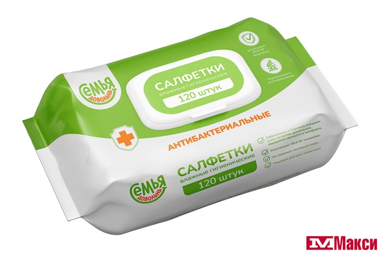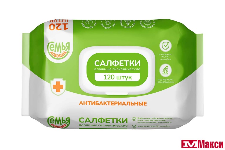 САЛФЕТКИ ВЛАЖНЫЕ "СЕМЬЯ ДОВОЛЬНА" АНТИБАКТЕРИАЛЬНЫЕ 120ШТ С КЛАПАНОМ