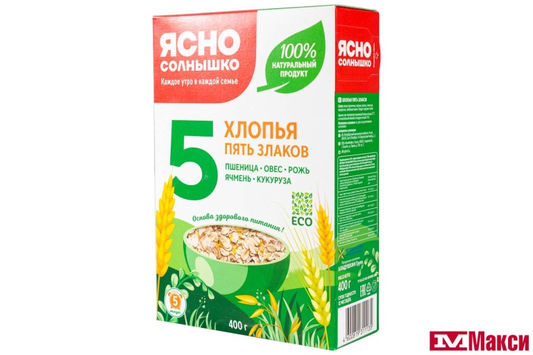 Хлопья 5 злаков — сбалансированный полезный завтрак для всей семьи, состоящий из пшеничных, овсяных, ржаных, ячменных и гречневых хлопьев. Время приготовления — 3 минуты.