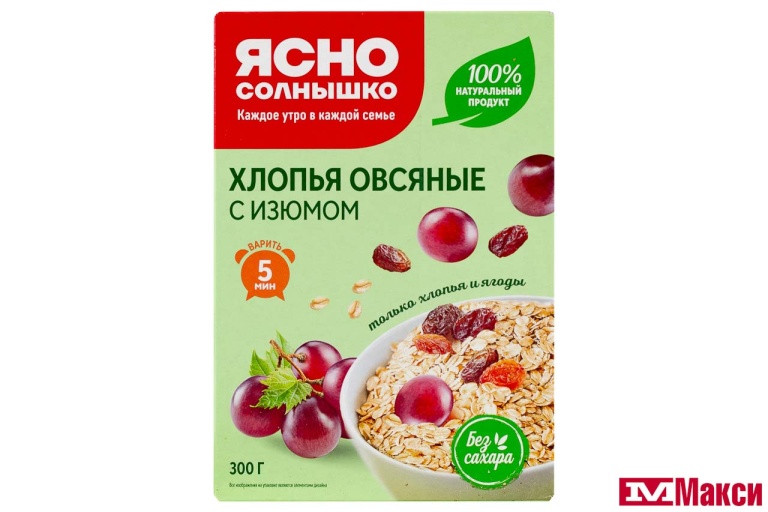 Овсяные хлопья с изюмом - это хлопья среднего размера с добавлением сушеного винограда. Для производства используется отборный изюм - настоящее природное лакомство с приятным послевкусием. Такой изюм считается самым качественным и обладает массой полезных свойств. Продукт изготовлен без добавления сахара