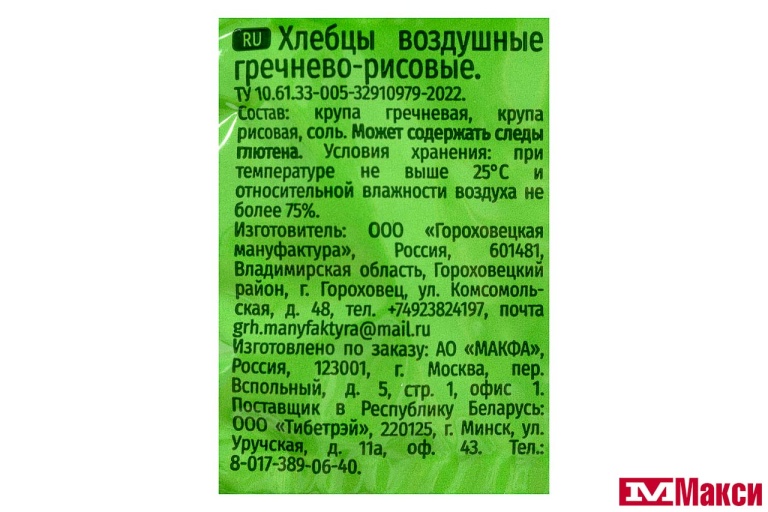 ХЛЕБЦЫ "МАКФА" ВОЗДУШНЫЕ ГРЕЧНЕВО-РИСОВЫЕ 60Г