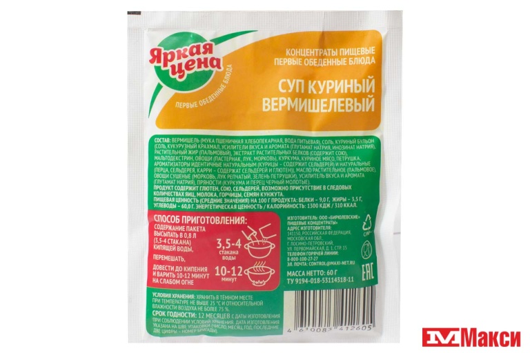 вермишель из пшеничной муки (мука пшеничная, вода), соль, бульон-приправа со вкусом курицы (соль, усилители вкуса и аромата ( глутамат натрия, инозинат натрия, гуанилат натрия), кукурузный крахмал, сахар, овощи (морковь, чеснок, петрушка, сельдерей, лук), растительные масла (пальмовое, подсолнечное), ароматизаторы натуральные (перца, карри) и идентичный натуральному (курицы (содержит яйца)), экстракт растительных белков, куркума, краситель (рибофлавин)), масло растительное (пальмовое), овощи (морковь, лук репчатый, петрушка), усилитель вкуса и аромата (глутамат натрия), пряности (куркума и перец черный молотые)