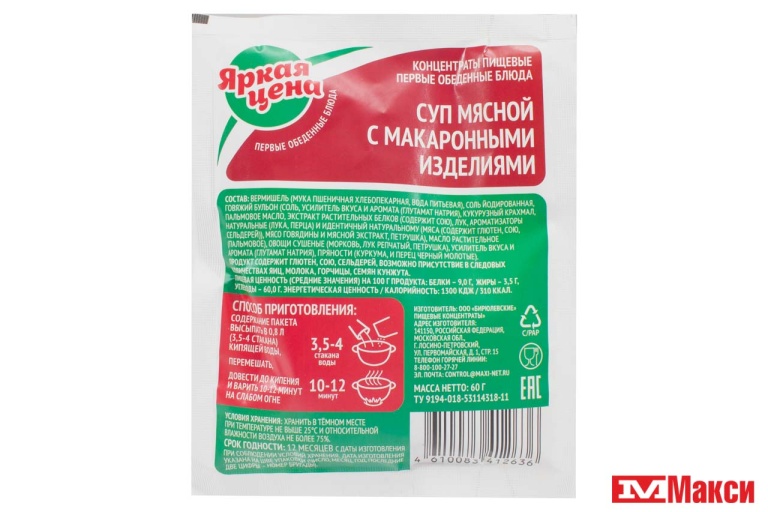 СУП "ЯРКАЯ ЦЕНА" МЯСНОЙ С МАКАРОННЫМИ ИЗДЕЛИЯМИ 60Г