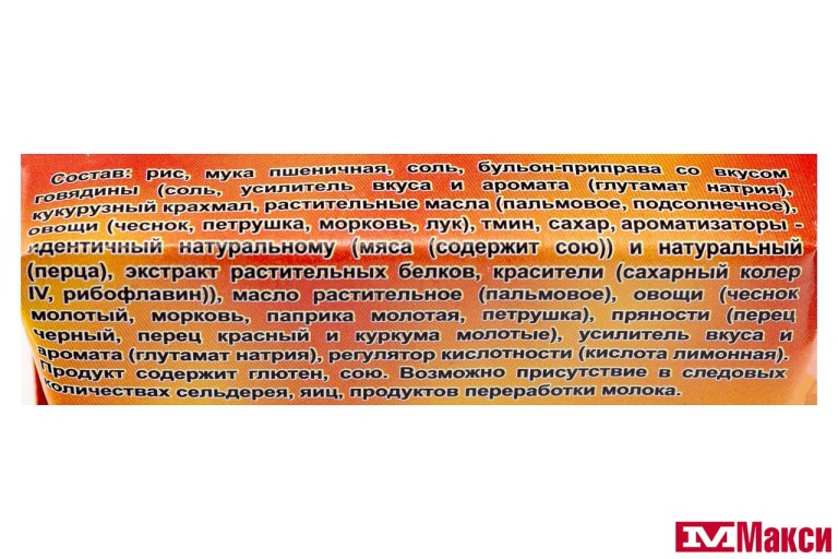 рис, мука пшеничная, соль, бульон-приправа со вкусом говядины (соль, усилитель вкуса и аромата (глутамат натрия), кукурузный крахмал, растительные масла (пальмовое, подсолнечное), овощи (чеснок, петрушка, морковь, лук), тмин, сахар, ароматизаторы - идентичный натуральному (мяса (содержит сою)) и натуральный (перца), экстракт растительных белков, красители (сахарный колер IV, рибофлавин)), масло растительное (пальмовое), овощи (чеснок молотый, морковь, паприка молотая, петрушка), пряности (перец черный, перец красный и куркума молотые), усилитель вкуса и аромата (глутамат натрия), регулятор кислотности (кислота лимонная)