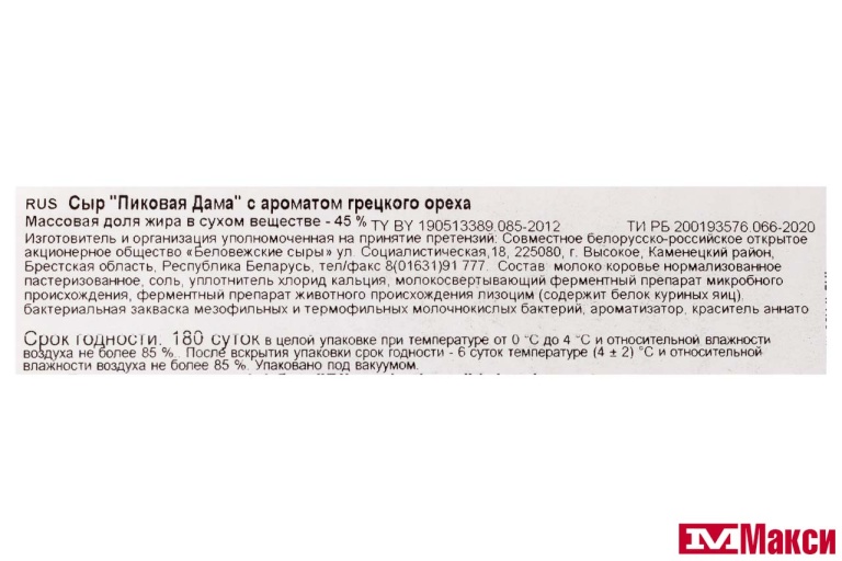 СЫР "ПИКОВАЯ ДАМА" СО ВКУСОМ ГРЕЦКОГО ОРЕХА 45% (БЕЛОВЕЖСКИЕ СЫРЫ) (БЕЛАРУСЬ) (БЗМЖ)[средн вес 8]