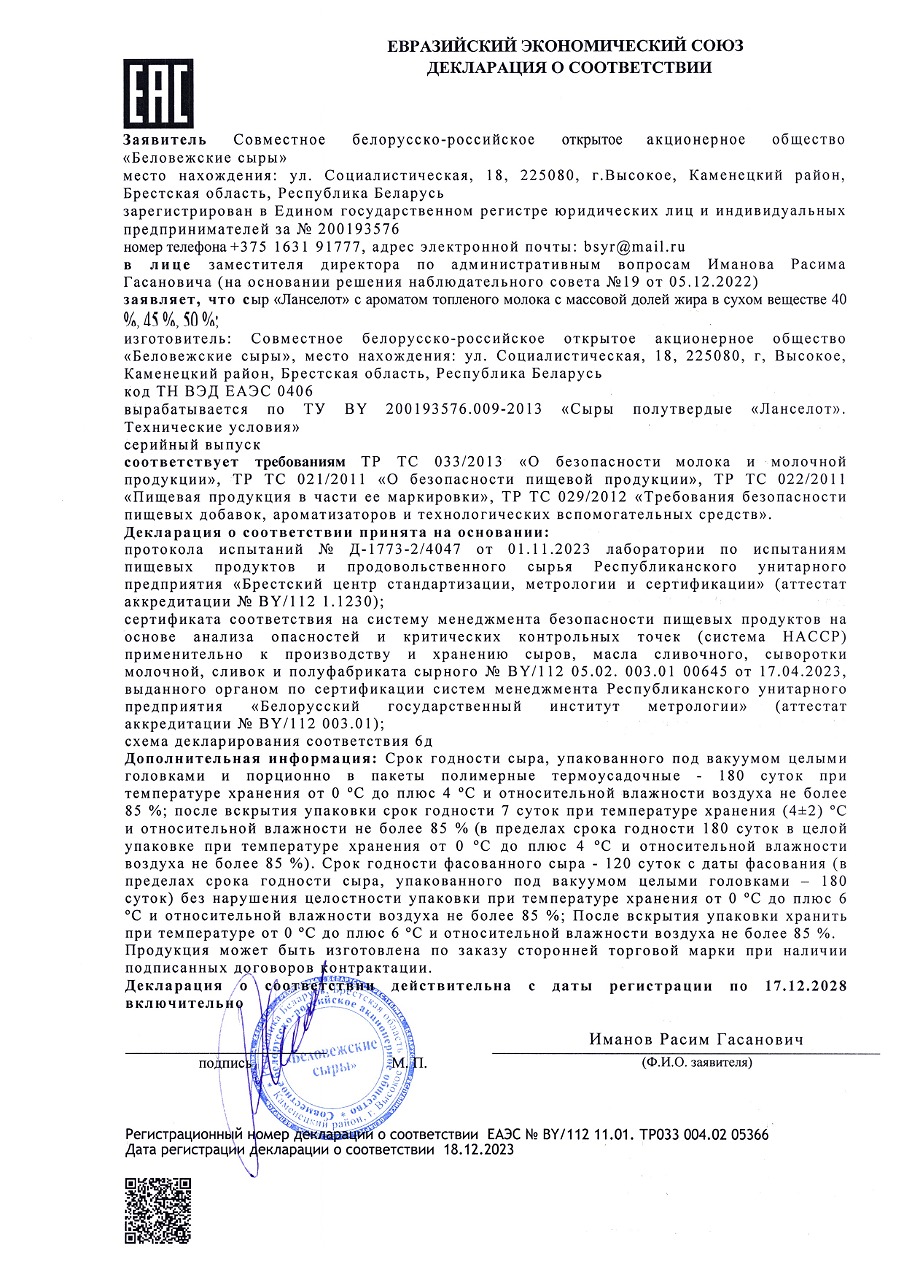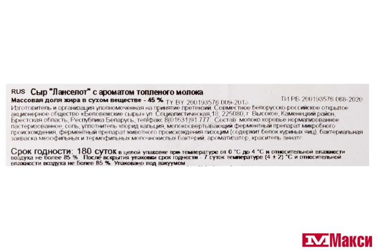 СЫР "ЛАНСЕЛОТ" СО ВКУСОМ ТОПЛЕНОГО МОЛОКА 45% БЗМЖ (БЕЛОВЕЖСКИЕ СЫРЫ) (БЕЛАРУСЬ) (БЗМЖ)[средн вес 8]
