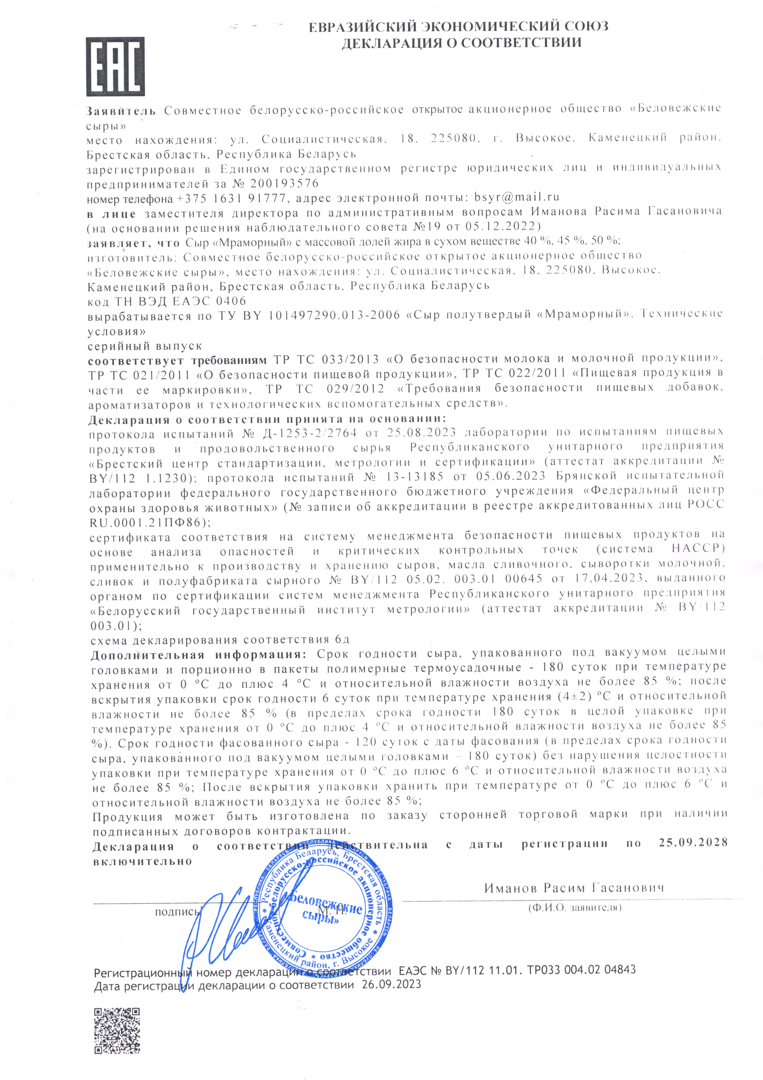 СЫР "МРАМОРНЫЙ" 45% 200Г (БЕЛОВЕЖСКИЕ СЫРЫ) (БЕЛАРУСЬ) (БЗМЖ)