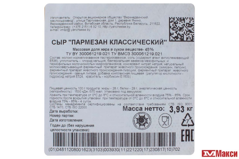 СЫР "ПАРМЕЗАН КЛАССИЧЕСКИЙ" 45% БРУС (АЛЬГЕРД) (БЕЛАРУСЬ) (БЗМЖ)[средн вес 7,2]