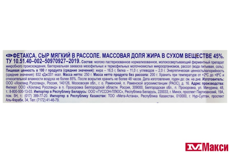 Молоко пастеризованное нормализованное, молокосвертывающий ферментный препарат микробного происхождения, бактериальная закваска мезофильных и термофильных молочнокислых микроорганизмов, рассол (вода питьевая, соль).