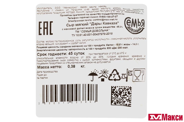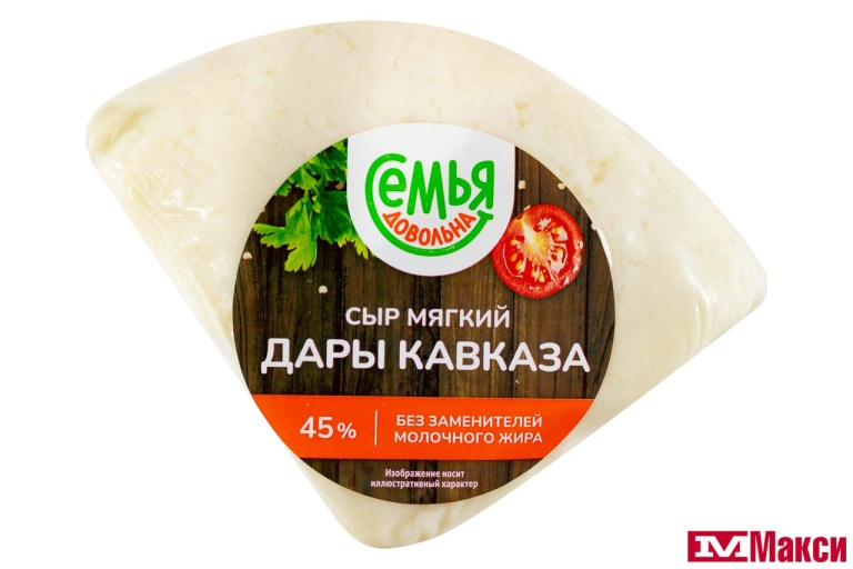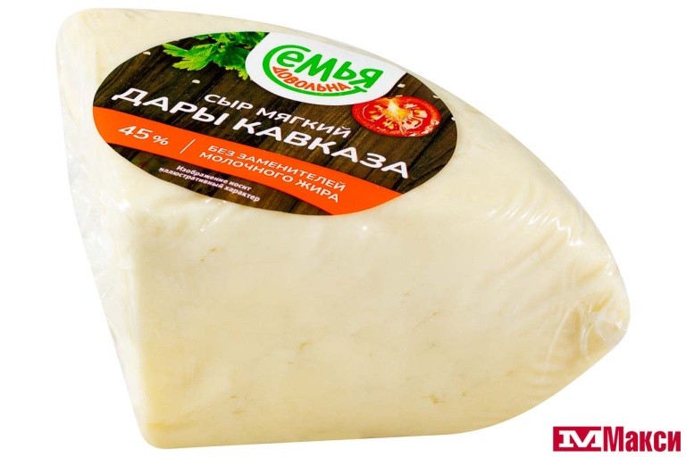 СЫР "ДАРЫ КАВКАЗА" 45% В/У (СЕМЬЯ ДОВОЛЬНА) (БЗМЖ)[средн вес 0,6]