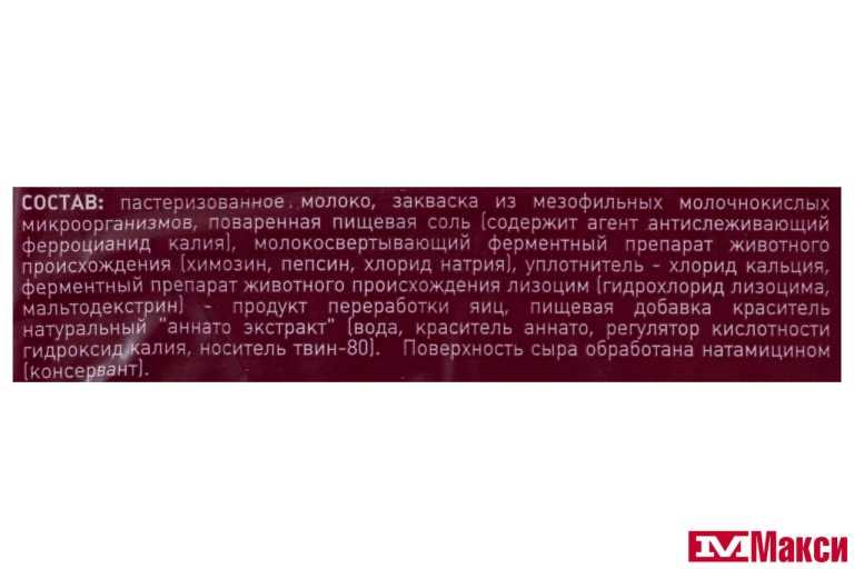 пастеризованное молоко, закваска из мезофильных молочнокислых микроорганизмов, поваренная пищевая соль (содержит агент антислеживающий ферроцианид калия), молокосвертывающий ферментный препарат животного происхождения (химозин, пепсин, хлорид натрия), уплотнитель - хлорид кальция, ферментный препарат животного происхождения лизоцим (гидрохлорид лизоцима, мальтодекстрин) - продукт переработки яиц, пищевая добавка краситель натуральный "аннато экстракт" (вода, краситель аннато, регулятор кислотности гидроксид калия, носитель твин-80); поверхность сыра обработана натамицином (консервант)