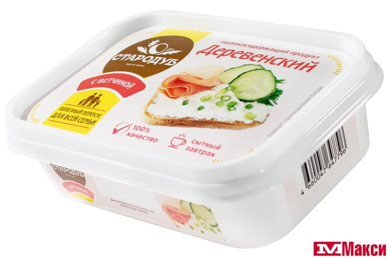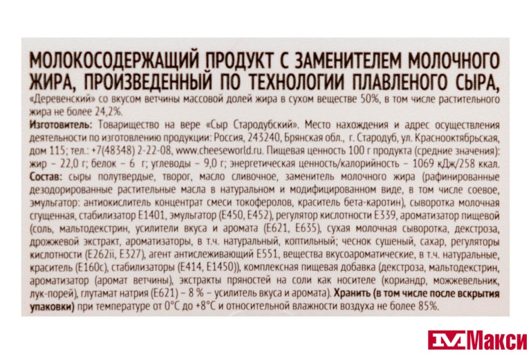сыры полутвердые, творог, масло сливочное, заменитель молочного жира (рафинированные дезодорированные растительные масла в натуральном и модифицированном виде, в том числе соевое, эмульгатор: антиокислитель концентрат смеси токоферолов, краситель бета-каротин), сыворотка молочная сгущенная, стабилизатор Е1401, эмульгатор (Е450, Е452), регулятор кислотности Е339, ароматизатор пищевой (соль, мальтодекстрин, усилители вкуса и аромата (Е621, Е635), сухая молочная сыворотка, декстроза, дрожжевой экстракт, ароматизаторы, в т.ч. натуральный, коптильный; чеснок сушеный, сахар, регуляторы кислотности (Е262ii, Е327), агент антислеживающий Е551, вещества вкусоароматические, в т.ч. натуральные, краситель (Е160с), стабилизаторы (Е414, Е1450)), комплексная пищевая добавка (декстроза, мальтодекстрин, ароматизатор (аромат ветчины), экстракты пряностей на соли как носителе (кориандр, можжевельник, лук-порей), глутамат натрия (Е 621) - 8 % - усилитель вкуса и аромата)