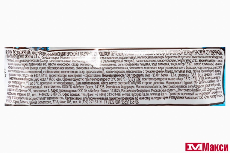 творог (молоко сухое обезжиренное, масло сливочное, вода питьевая, молокосвёртывающий ферментный препарат животного происхождения, закваска), глазурь кондитерская (сахар, заменитель какао-масла лауринового типа (пальмоядровый стеарин), масло кокосовое, какао-порошок, эмульгатор Е322, ароматизатор), сахар, крошка печенья (мука пшеничная в/с, масло кокосовое, сахар, молоко сухое обезжиренное, соль поваренная пищевая, вода питьевая, эмульгатор Е322), масло сливочное, начинка кондитерская "Варёная сгущёнка" (сахар, сухое обезжиренное молоко, сыворотка молочная деминерализованная, заменитель молочного жира (пальмовое и его фракции, подсолнечное, рапсовое масла в различных соотношениях), стабилизатор консистенции агар, пищевой натуральный краситель карамельный коллер, ароматизатор "Тоффи"), какао-порошок, консервант-сорбат калия, ароматизатор "Ром"