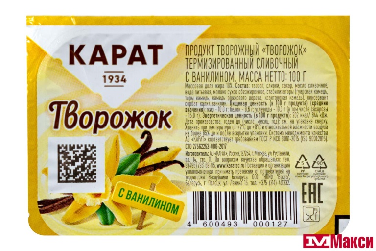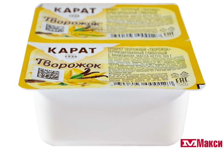 Продукт творожный КАРАТ Творожок сливочный с ванилином 10%, без змж произведен из натурального творога с добавлением сливок и ванилина. Легкая текстура достигается за счет интенсивного перемешивания. Творожок имеет нежную мягкий вкус и идеально подходит для завтрака, легкого обеда или перекуса.