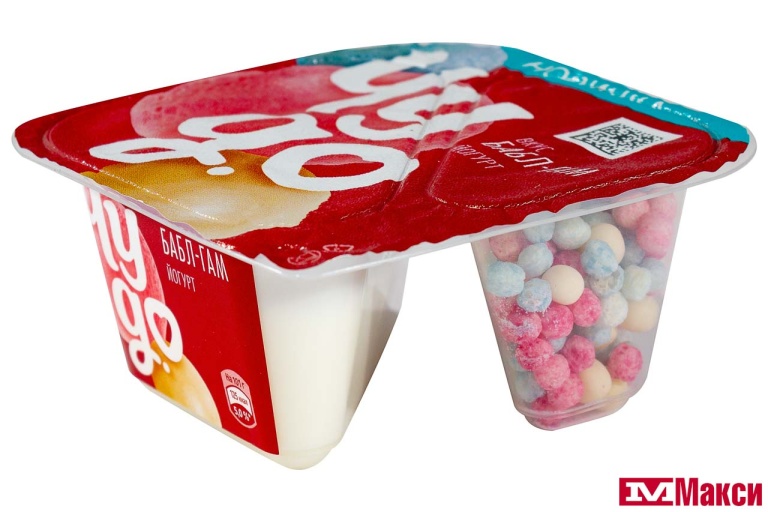 Йогурт с массовой долей жира 4,0 %, со злаковыми шариками со вкусом бабл-гам и злаковыми шариками в белой шоколадной глазури.