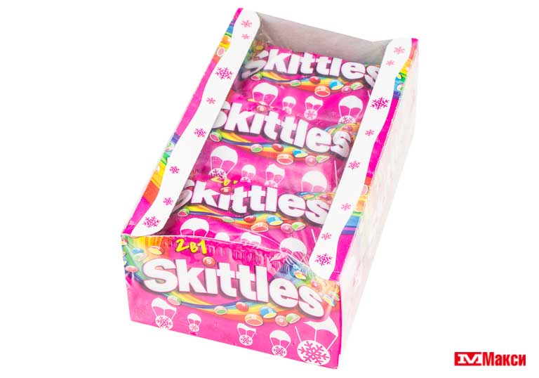 Драже Skittles c разноцветной глазурью предлагают радугу фруктовых вкусов в каждой упаковке! Вкус 2 в 1 - это в два раза больше радуги, ведь в каждом драже - два фруктовых вкуса! Заразитесь радугой, попробуйте радугу!
