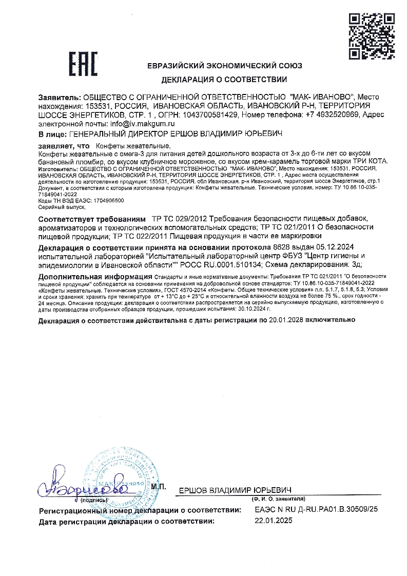 Жевательные конфеты для детей "Три кота" от ГК "Сладкая сказка" - натуральный продукт, с Омега-3 в составе,которая способствуют здоровому и правильному росту ребёнка, повышает количество серотонина ("гормона счастья") в крови, улучшает зрение, укрепляет кости и увеличивает внимательность. Такие конфеты - прекрасный подарок сладкоежкам. Жевательные конфеты "Три кота" производятся на российской фабрике "МАК-Иваново" с использованием только натуральных красителей и ароматизаторов. Конфеты не содержат трансжиров. Всего в линейке жевательных конфет "Три кота" - три уникальных вкуса: клубничное мороженое, банановый пломбир и крем-карамель. Оригинальное ассорти под любое настроение! Каждая конфета упакована в индивидуальную упаковку с изображением одного из героев мультсериала - Коржика, Карамельки или Компота. Жевательные конфеты "Три кота" понравятся маленьким сладкоежкам и поклонникам одноименного мультфильма. Конфеты от ГК "Сладкая сказка" - прекрасный вариант для сладкого подарка
