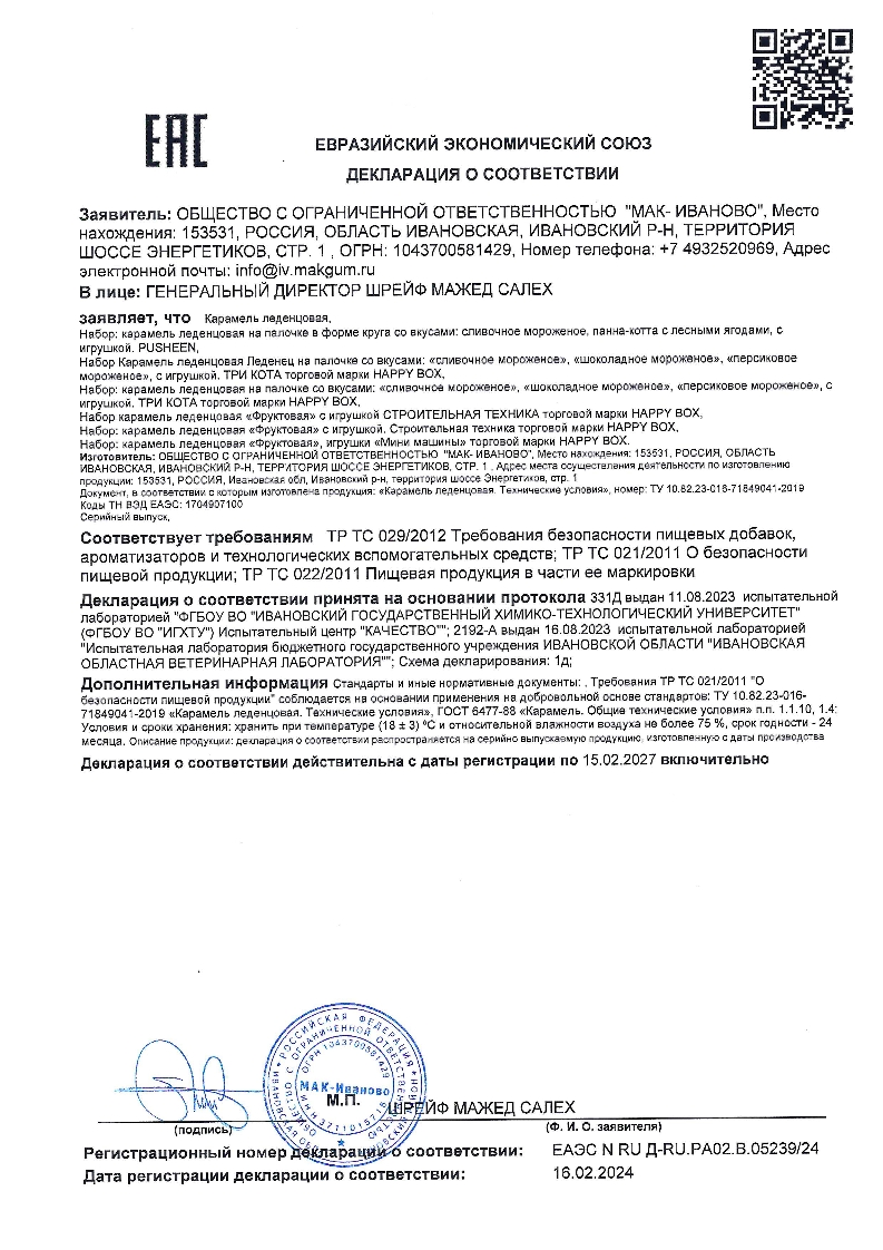 со вкусом «сливочное мороженое» состав: сахар, патока, вода питьевая, регулятор кислотности: лимонная кислота; ароматизаторы натуральные: ванильно-сливочный, ваниль; краситель (поверхностный) карбонат кальция; со вкусом «шоколадное мороженое» состав: сахар, патока, вода питьевая, регулятор кислотности: лимонная кислота; ароматизаторы натуральные: ванильно-сливочный, шоколад; красители: сахарный колер (III), краситель (поверхностный): карбонат кальция; со вкусом «персиковое мороженое» состав: сахар, патока, вода питьевая, регулятор кислотности: лимонная кислота; ароматизаторы натуральные: ванильно-сливочный, персик; красители: каротины; краситель (поверхностный): карбонат кальция