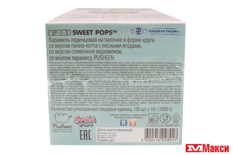 КАРАМЕЛЬ "SWEET POPS" PUSHEEN НА ПАЛОЧКЕ 10Г (ЭВР)