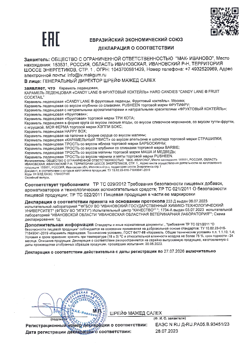 карамель леденцовая со вкусом лесные ягоды: сахар, патока, вода питьевая, регулятор кислотности: лимонная кислота; ароматизаторы натуральные, краситель (поверхностный): карбонат кальция. Карамель леденцовая со вкусом сливочное мороженое: сахар, патока, вода питьевая, регулятор кислотности: лимонная кислота; ароматизаторы натуральные, краситель (поверхностный): карбонат кальция. Карамель леденцовая со вкусом тутти-фрутти: сахар, патока, вода питьевая, регулятор кислотности: лимонная кислота; ароматизаторы натуральные, краситель (поверхностный): карбонат кальция.
