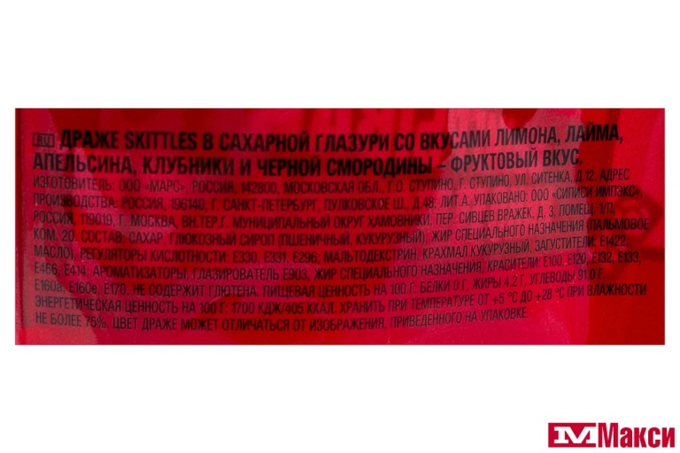 Cахар, глюкозный сироп (пшеничный, кукурузный), жир специального назначения (пальмовое масло), регуляторы кислотности: E330, E296; загустители: E1400, E1422; ароматизаторы, регулятор кислотности E331, глазирователь, E903, жир специального назначения, красители: E120, E170, E100, E132, E160a, E133, E160e.