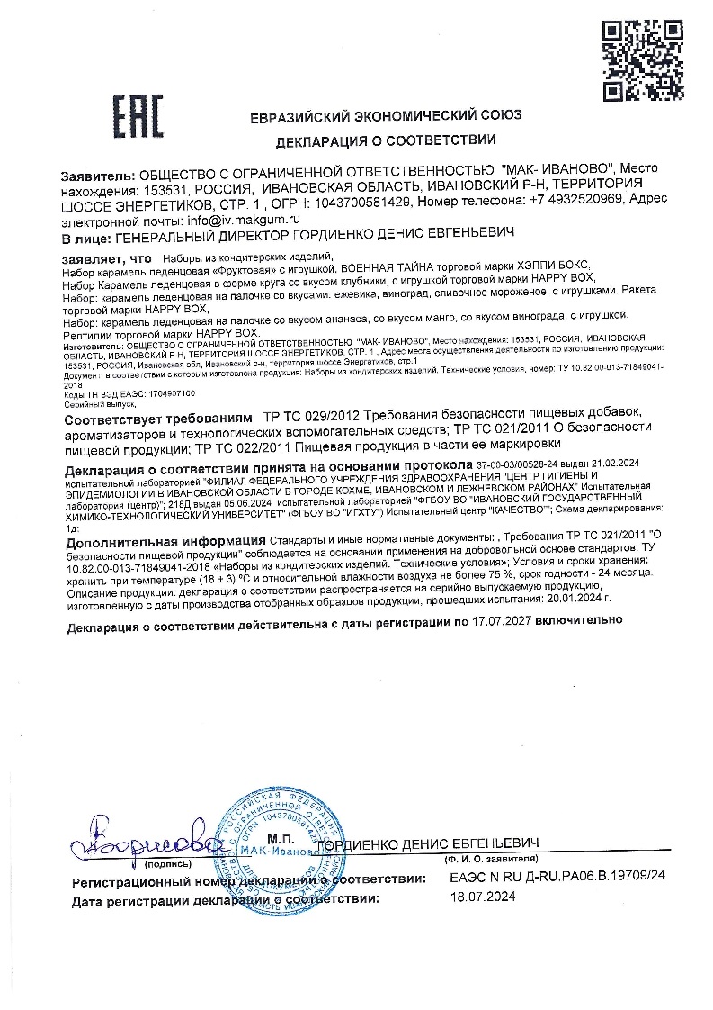 со вкусом ананаса: патока, сахар, вода питьевая, регулятор кислотности: лимонная кислота; красители: куркумин, каротины; ароматизатор натуральный: ананас. Со вкусом манго: патока, сахар, вода питьевая, регулятор кислотности: лимонная кислота; экстракт порошка сока красной свеклы; красители: куркумин, каротины; ароматизатор натуральный: манго. Со вкусом винограда: патока, сахар, вода питьевая, регулятор кислотности: лимонная кислота; ароматизатор натуральный: виноград; экстракт чёрной моркови. Со вкусом сливочное мороженое: патока, сахар, вода питьевая, регулятор кислотности: лимонная кислота; ароматизаторы натуральные: ванильно-сливочный, ваниль; краситель (поверхностный) карбонат кальция